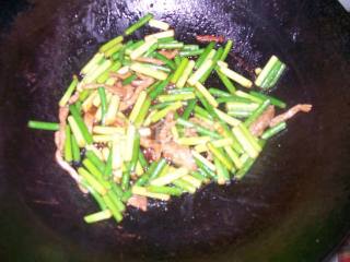 5.加蒜苔,翻炒,瀝少許水,加適量鹽,翻炒均勻即可。