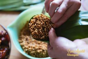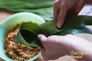 6. 左手捏住粽葉,右手添加食材,一勺糯米加一塊五花肉,再鋪一層糯米加一個蛋黃,最后用糯米蓋住蛋黃。