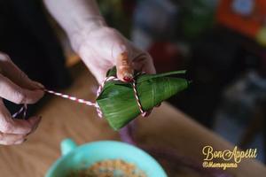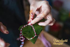 9. 棉繩取粽葉的長度,一折為二,在繩子的1/3和2/3的地方打結。把粽子錐形部分套入棉繩的中間繩結處,