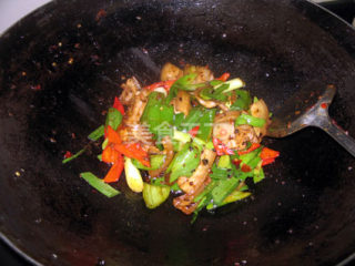 8加入青紅椒,炒至斷青