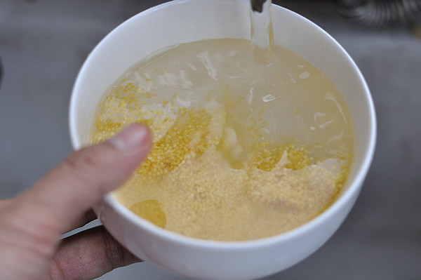2.砂鍋里倒入足夠清水,倒入淘洗好的小米大火煮開后,改小火。
