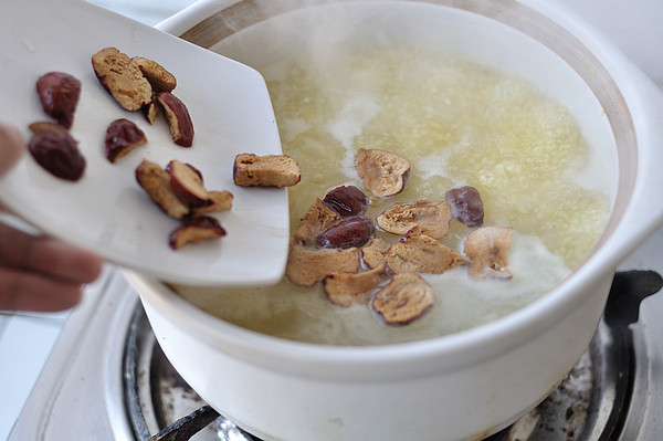 5.把切好的紅棗片倒入小米粥中,小火燉30分鐘至米粥粘稠。