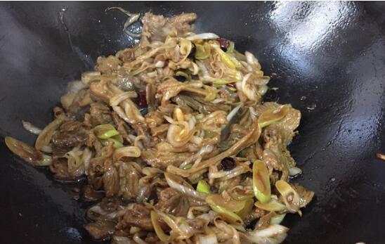 8.加入煸炒過的羊肉卷,少許老抽,翻炒均勻,出鍋前淋入一勺米醋翻拌下即可