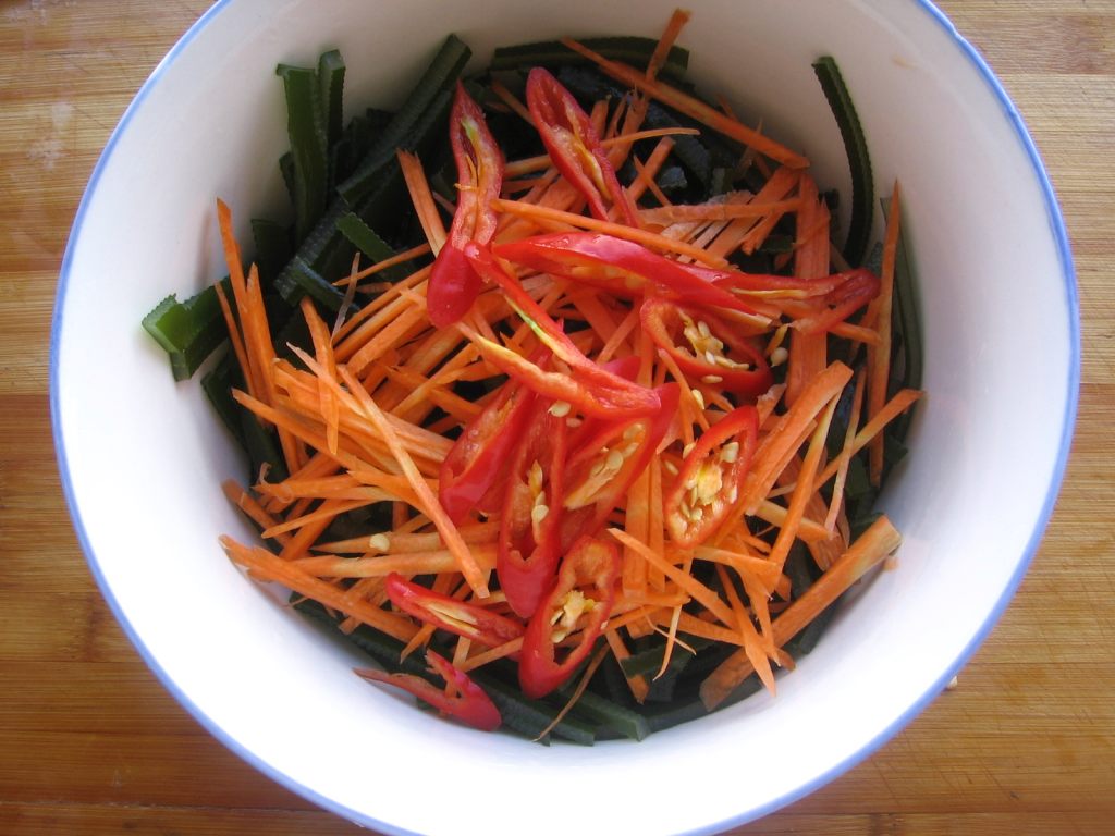 7.將海帶絲,胡蘿卜絲,紅椒絲放在一起。