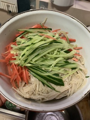 大熱天就想吃酸辣清爽的菜,最好還是簡單易做不用動不用出汗的…用料  黃瓜 半根胡蘿卜 1根香菜 適量金針菇 1把小尖椒 6個大蒜 4瓣涼拌三絲的做法步驟圖  金針菇掰小撮,焯水煮熟后放涼。2. 黃瓜和胡蘿卜不用煮,直接切絲,放入放涼的金針菇。3. 調(diào)涼拌汁,小尖椒切小段,加入蒜蓉、鹽、醬油、醋、味精(我用的醬油自帶點(diǎn)甜味,所以我沒額外放糖,涼拌汁可以加點(diǎn)白糖