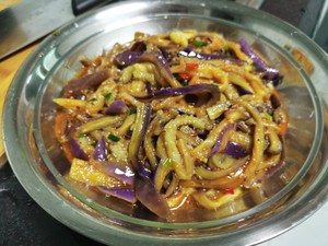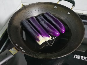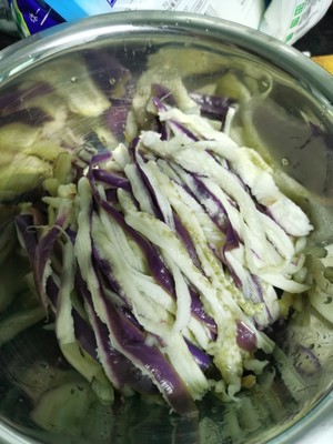 3. 茄子蒸熟(用筷子插茄子端部白色處,能穿透就可以),放涼,手撕成條,放入小盆中備用。