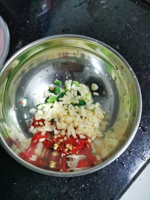 2. 3個小米辣切末,喜歡吃辣的可以切碎點,2根小蔥切成小段,1個獨蒜切成蒜末,一起放入碗中備用。