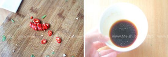 3.小紅椒切末,醋、白糖、鹽、牛肉粉和海鮮醬油,根據(jù)自己的口味調(diào)成料汁
