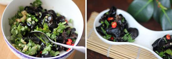 4.黑木耳控干水分,放入切好的小蔥、香菜、蒜末和紅辣椒,倒入調(diào)好的料汁,攪拌均勻即可