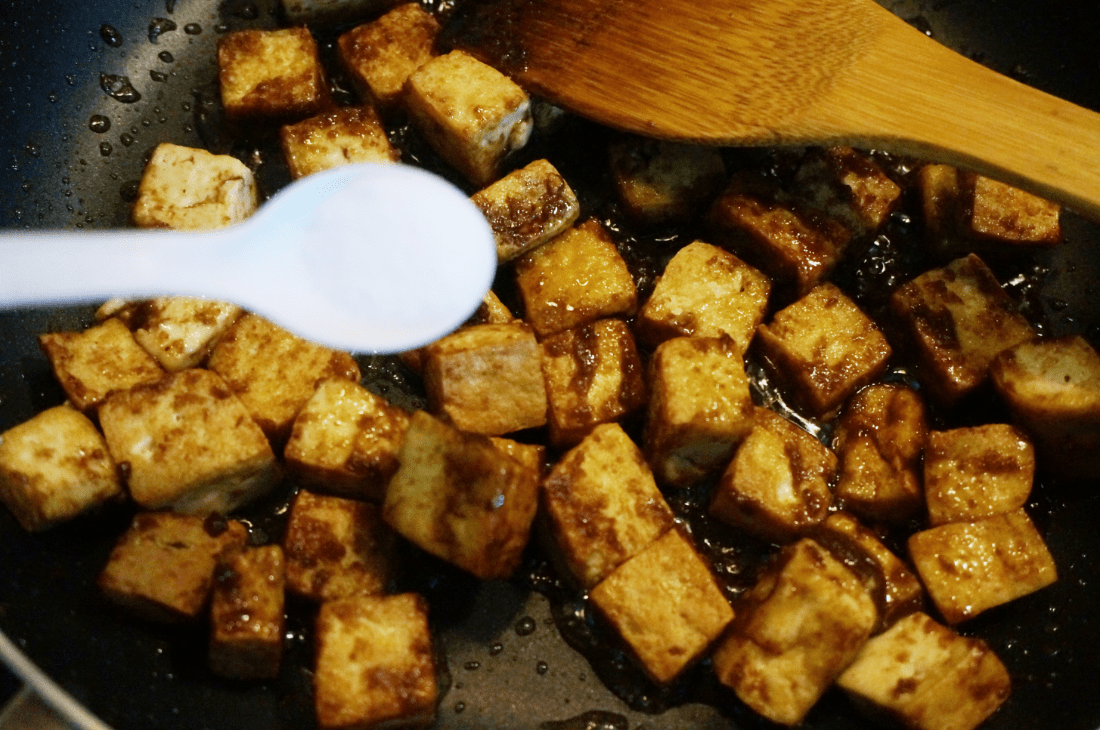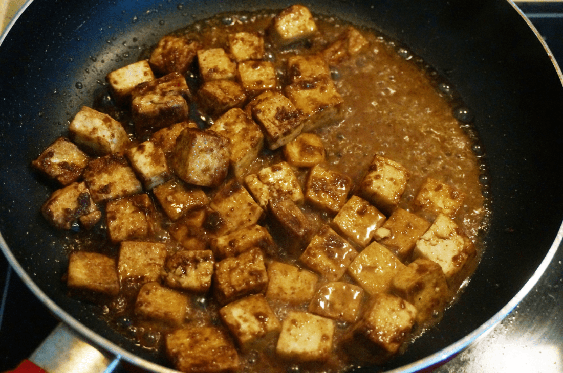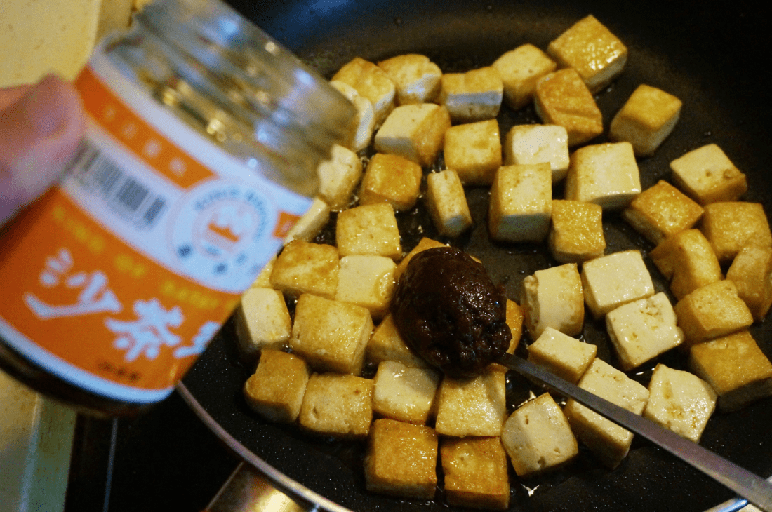 這道煎豆腐用了沙茶醬來(lái)調(diào)味。沙茶醬的主要成分就是海蝦、扁魚(yú)、辣椒粉、鹽等等,所以用它做出來(lái)的豆腐真是味道很鮮美。