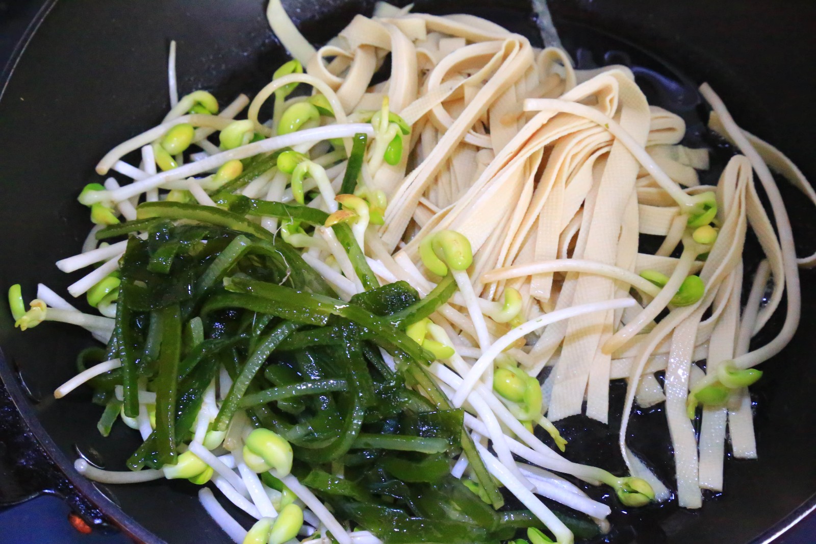 3. 起油鍋,將海帶,黃豆芽,干絲放入,煸炒一會加入生抽,黑胡椒粉和適量開水一起煮。煮開后轉(zhuǎn)小火燜煮20分鐘。