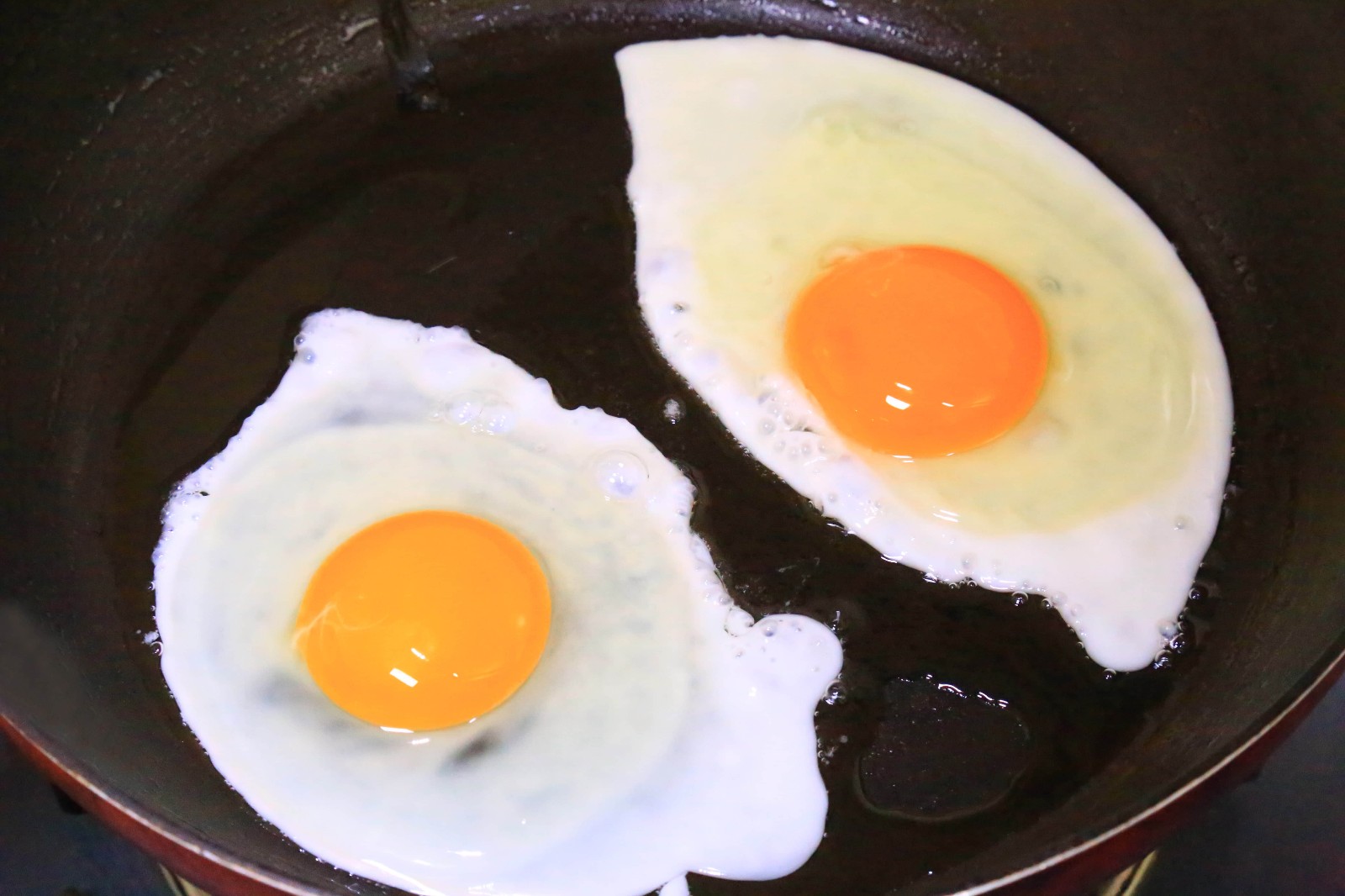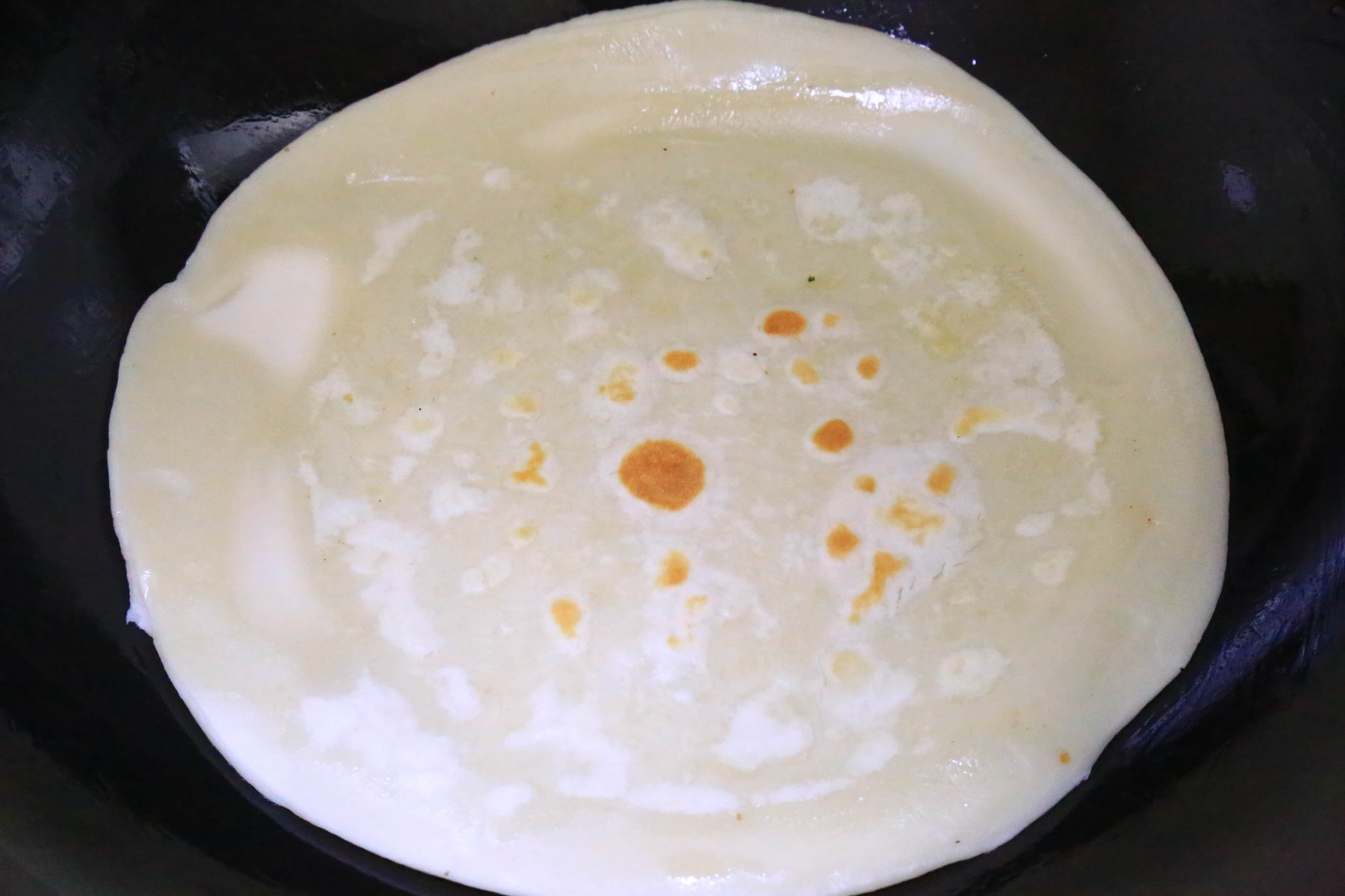 7. 鍋燒熱后,在鍋內(nèi)刷一層色拉油。將餅皮放入??吹斤炂す陌蠓妫D(zhuǎn)小火煎。兩面各煎1分鐘即可。
