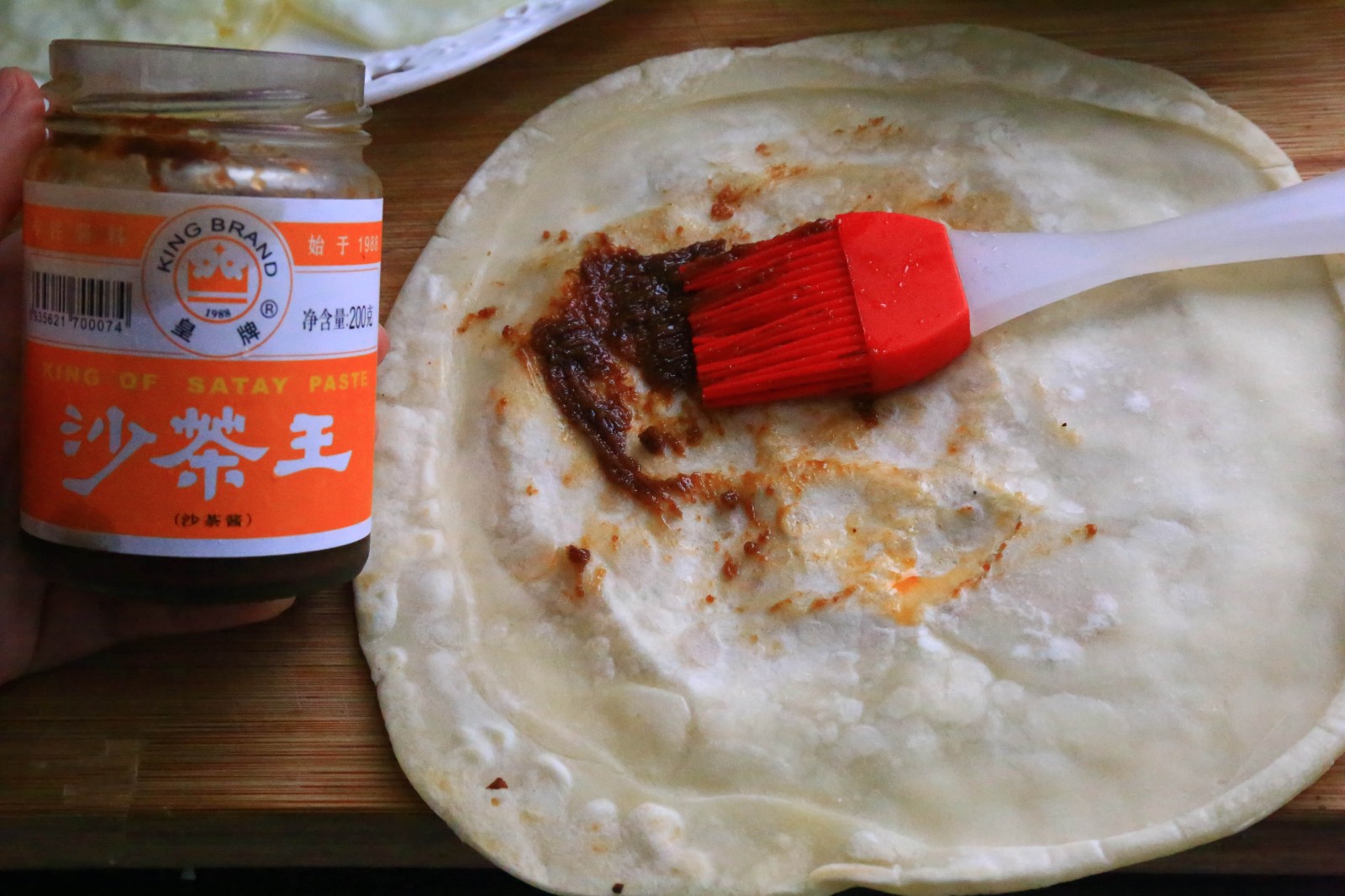 10. 在餅皮上先刷一層皇牌沙茶王,再刷一層甜面醬。