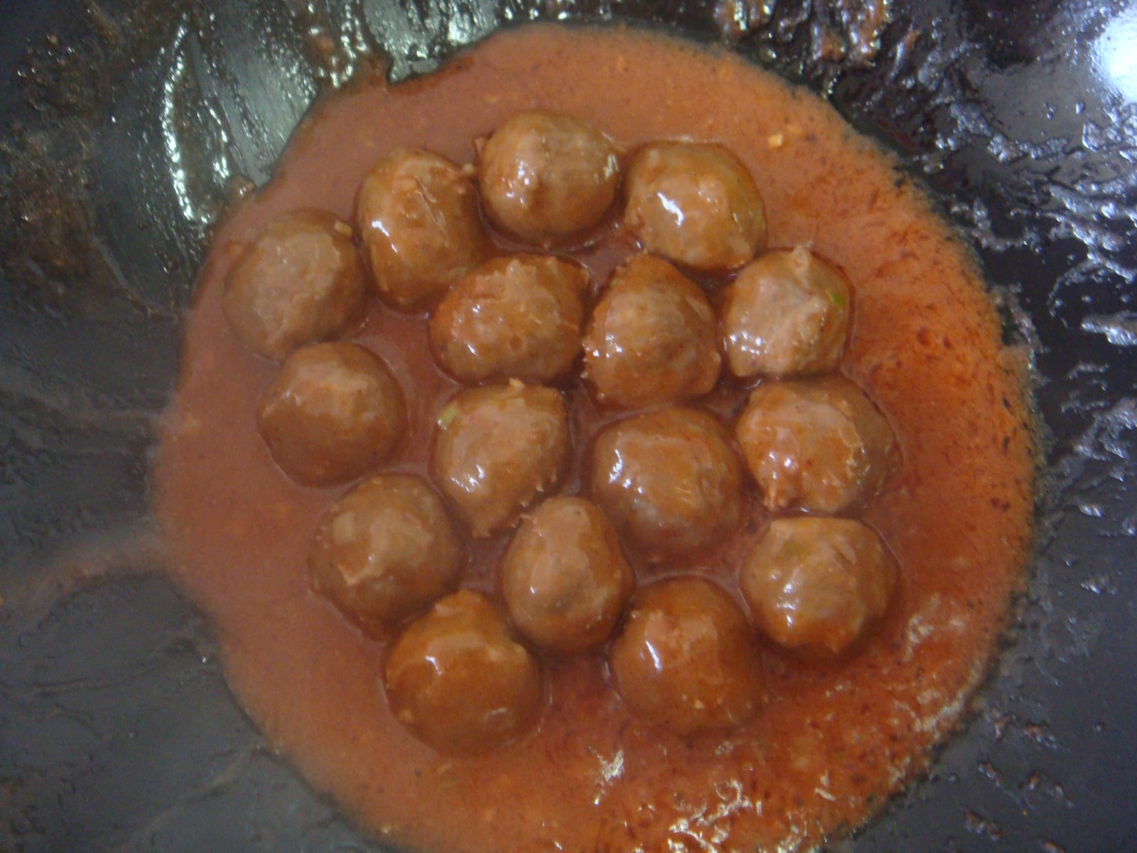牛肉丸:250克、皇牌沙茶王:2勺、番茄沙司:2勺、鹽:1克、糖:2克、淀粉:適量、蔥姜:適量,熟芝麻:1小撮。