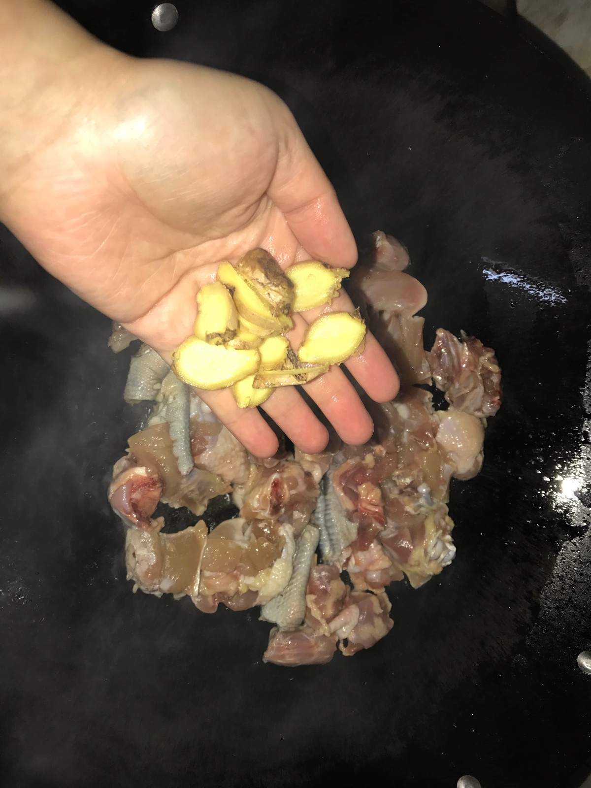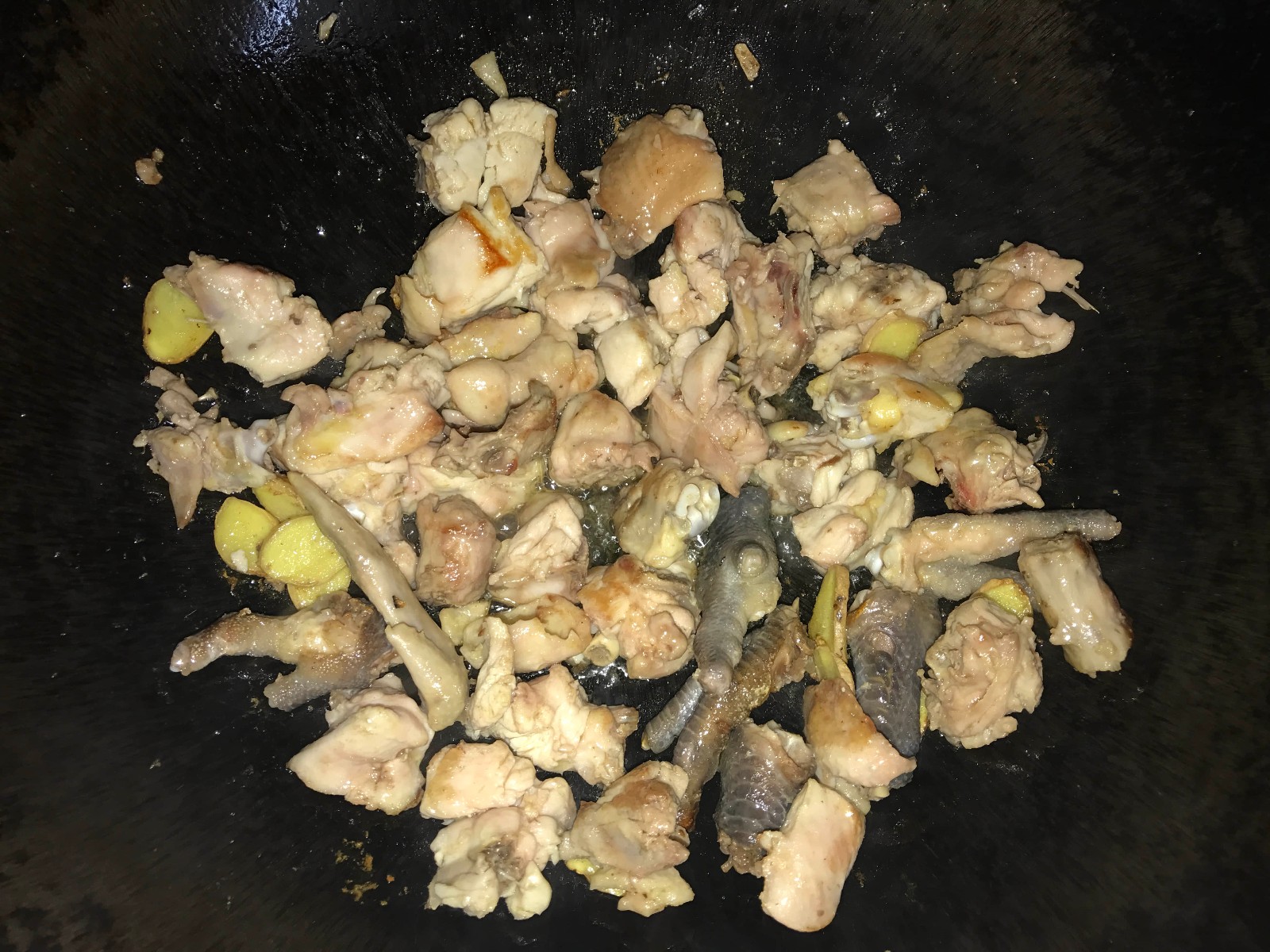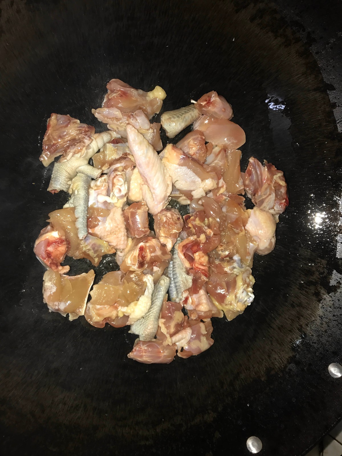 4. 雞下鍋,攤開(kāi)煎一面,然后再翻炒