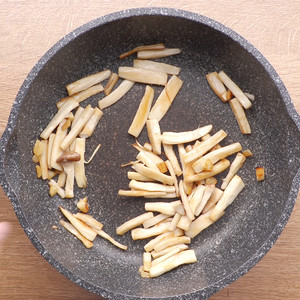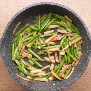時間:約10-15分鐘難度:零廚藝??份量:2~3人份用料  杏鮑菇 150g蘆筍 150g油 10g蒜 3瓣生抽 5g蠔油 10g黑胡椒碎 少許鹽 1g蘆筍杏鮑菇的做法步驟 步驟1.杏鮑菇手撕成條。步驟2.蘆筍斜切,焯水,變色即撈出。步驟3.鍋中倒油,炒香蒜粒,倒入杏鮑菇大火炒,炒干杏鮑菇表面的水分,微微焦黃。步驟4.倒生抽、蠔油炒勻。步驟5.倒入蘆筍繼續(xù)翻炒,放黑