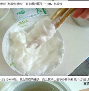 打過大約20分鐘,蛋清打成了“奶油”樣,是提起筷子也不會(huì)掉下來的程度。我第一次用的筷子,但真的很費(fèi)力,推薦用手動(dòng)或電動(dòng)打蛋器。電飯鍋?zhàn)龅案獾淖龇?nbsp;