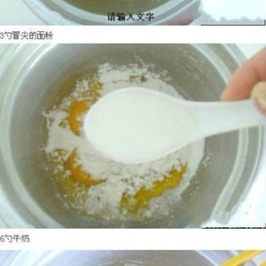 蛋黃里加2勺糖、3勺冒尖的面粉、6勺牛奶,面粉是普通面粉,我還用過低筋的,但覺得還是普通面粉好。電飯鍋?zhàn)龅案獾淖龇?nbsp;