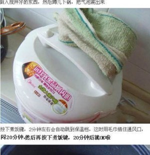 按下煮飯鍵,2分鐘左右會(huì)跳到保溫檔,此時(shí)用濕毛巾捂住通風(fēng)口,悶20分鐘,然后再按下煮飯鍵,再等20分鐘就可以出鍋了??電飯鍋?zhàn)龅案獾淖龇?nbsp;
