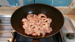 4. 炒鍋燒熱,加入食用油1湯匙(約10g)。把腌好的蝦仁像這樣平鋪在鍋內(nèi)煎。