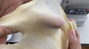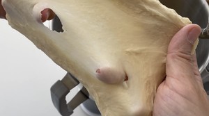 4. 把面團攪拌至完全擴展階段,就是切下一塊面團,用手撐開面團呈現(xiàn)薄膜狀,把薄膜放在手掌上,透過薄膜可以清晰的看到手掌紋,俗稱手套膜,當然也沒必要完全追求一個完美的手套膜,用手戳薄膜產(chǎn)生一個破洞后,洞口邊緣成規(guī)則的圓形就可以了,測量面團溫度在24-26度就可以了。