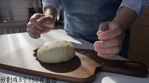 7. 一發(fā)好的面團要先分割成150克一個的小面團,分割好的面團用雙手攏住遠端面團,做向內(nèi)回收的動作,將面團快速滾圓,蓋上保鮮袋室溫下松弛5分鐘(這里要說一下松弛的必要性,我們切割面團的過程會造成已經(jīng)形成的面筋斷開,這時候松弛就會使切斷的面筋重新修復(fù),同時還可以增加面團的可塑性,松弛不好的面團有一個最常見的現(xiàn)象,就是不聽話,你要想把面團搟開,面團會自己回縮,所以面團的松弛是很重要的)。