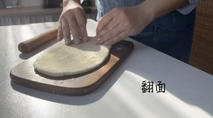 10 接著用搟面杖輕輕將面團由中間分別向上、向下?lián){開,把面團搟成長方形然后翻面,這時面團的收口處又朝上了,將面團的最下端用手按壓薄,雙手從面團上端向下卷起,一直卷到最下端收口捏緊