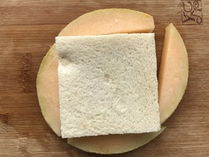 15. 把切好的吐司擺在蜜瓜上,切出跟吐司一樣大小的蜜瓜切片來