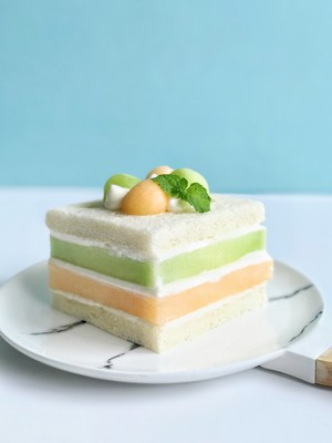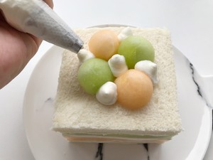 19. 頂部擺上蜜瓜球,再用裱花嘴間隔擠幾下奶油做點綴