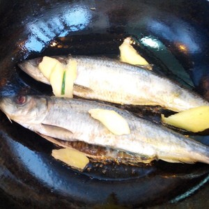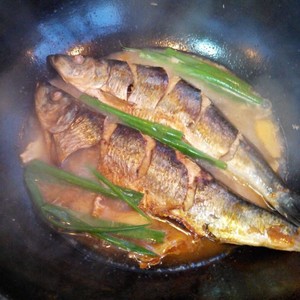 2. 少油四成熱,煎至表皮微黃,加適量糖,變色后加適量熱水,醬油中火燒15分鐘,大火收汁;