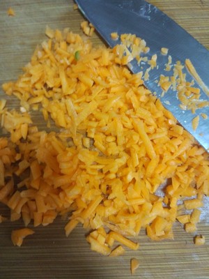 胡蘿卜先擦成絲,再剁碎點(diǎn),香蔥和青柿子椒切碎備用。