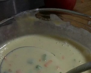4. 在餳好的稠面湖中加入剩余的水?dāng)嚢杈鶆?,加入切好的蔬菜和適量的鹽攪拌均勻。狀態(tài)是可流動(dòng)又很順滑的面糊。(鹽別加太少,太少不好吃)
