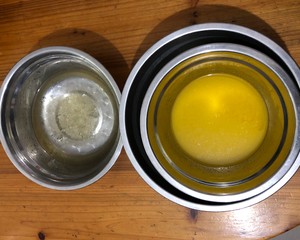 3. 先把黃油隔熱水融化至無顆粒,吉利丁片用常溫水泡軟,泡軟之后將水倒了備用