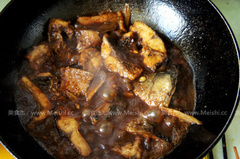 6.放入魚塊、鹽、大火燒開后用湯勺舀去浮沫,蓋上鍋蓋轉小火燉20分鐘,撿去八角大料蔥段等,最后倒入蠔油,用旺火收濃湯汁,放入味精即可出鍋