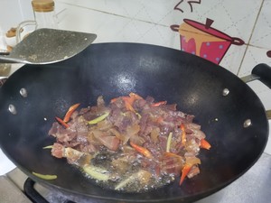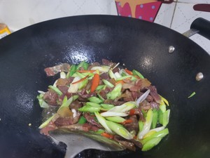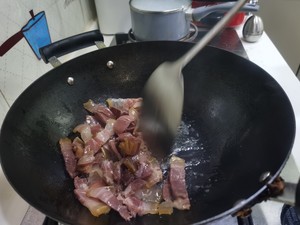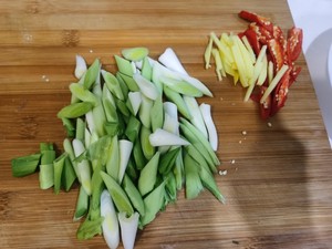 臘肉,咸肉,秋日里必不可少的一道菜。蘊含陽光的味道,美哉!用料 臘肉 1塊蒜苗 10根生抽 2勺鹽 若干小米椒 4個姜 若干片臘肉炒蒜苗的做法步驟圖 小米椒,姜絲。蒜苗分成蒜苗頭與蒜苗葉。2. 蒜苗葉濾干3. 臘肉用水沖,浸泡不會。需焯水,去除咸味。放油炒,炒至肥肉部分透明。4. 炒至這個色澤,開始放入辣椒、姜絲,翻炒。5. 加入蒜苗頭,翻炒一會。6.