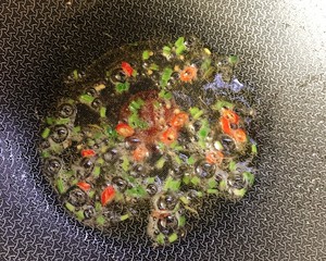 3. 炒鍋倒油,放蔥花和小紅辣椒炒出香味