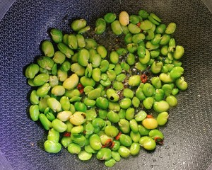 4. 下蠶豆瓣翻炒,嫩蠶豆很容易就能炒熟,翻炒一會(huì)加入適量鹽和一點(diǎn)清水,蓋上鍋蓋燜2分鐘