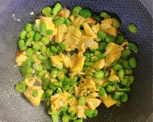 5. 倒入雞蛋快速的翻炒幾下,(這里可以放點(diǎn)胡椒粉)食材入味,就能裝盤了,沒有放入雞精,蠶豆本身都很鮮,不需要再加入雞精了