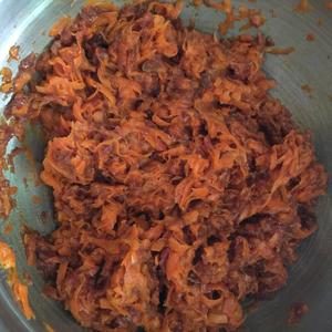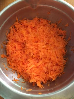 2. 紅蘿卜擦絲,用刨芝士的刀就可以。放油和鹽略炒。