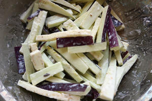 4.將茄子切成4-5厘米長(zhǎng)、1厘米寬的小條,放入清水內(nèi)浸泡后瀝干水分拍生粉,將鍋內(nèi)倒油燒熱至7成時(shí),