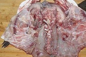 1. 將魚頭去腮,去頭下一段魚肉的魚鱗,將魚膛中的殘留雜物去掉,特別是黑色的膜,一定要去掉