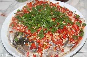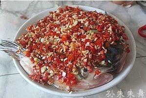 8. 將拌好的剁椒平鋪到盤子中的魚頭上,然后放入水已燒開的蒸鍋中,旺火蒸10~12分鐘(根據(jù)魚頭的大小