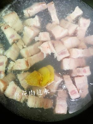 1. 五花肉切小塊,加入兩片姜片,倒入適量料酒,過(guò)水,撈出備用。