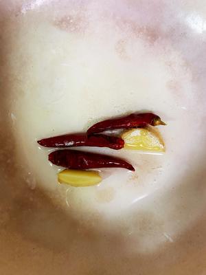 3. 土鍋倒入適量油,熱鍋冷油,加入姜片兩片3根干辣椒,翻炒出香味。