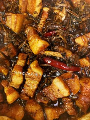 9. 20分鐘后,再加入泡發(fā)好的梅干菜,接著中小火燉20分鐘。