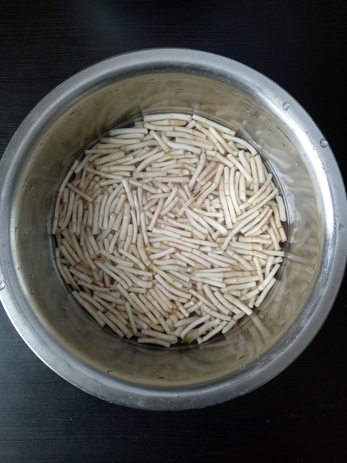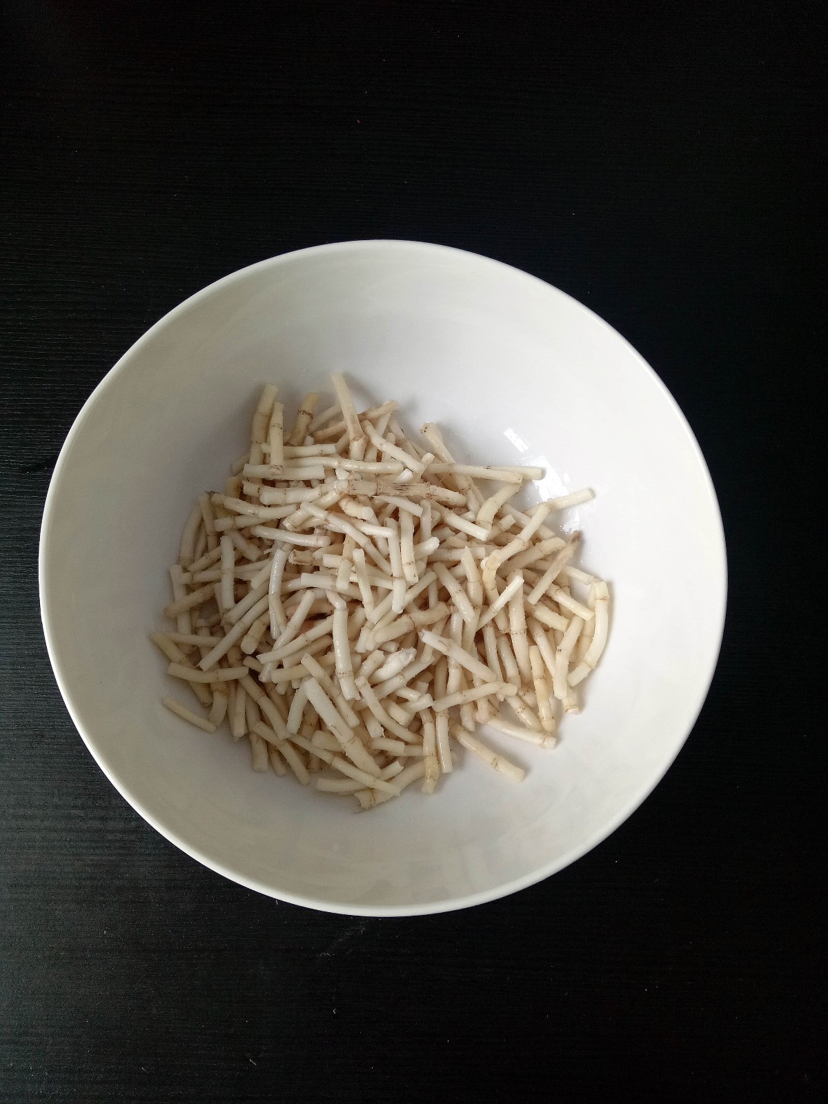 3、洗凈的魚腥草,調(diào)入適量鹽,拌勻后腌制片刻;魚腥草需濾掉多余的水份;