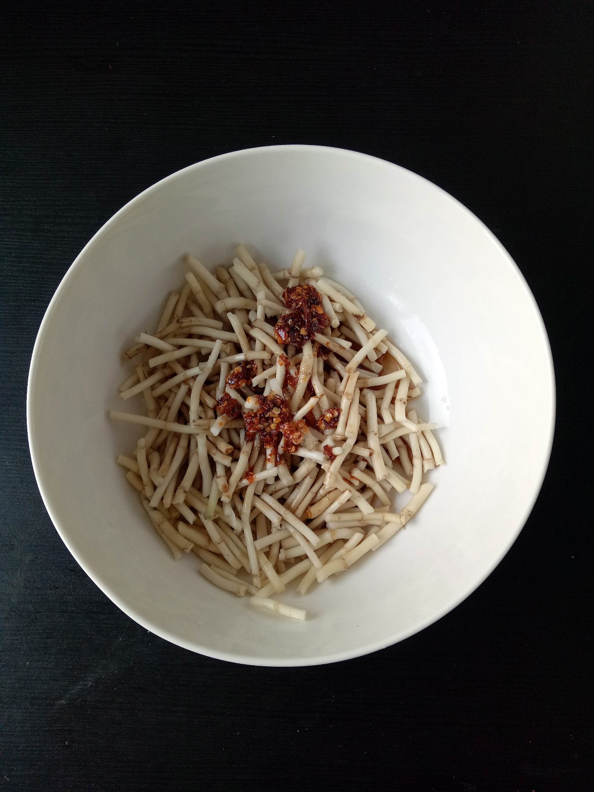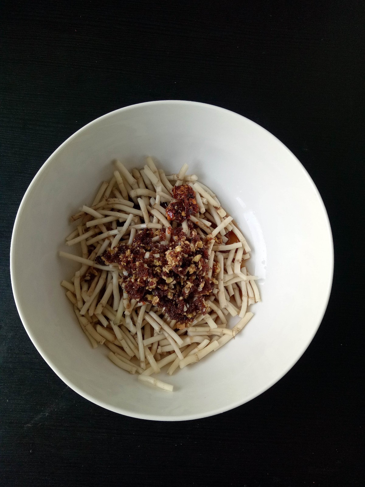 7、魚腥草腌制入味后,調(diào)入適量細砂糖,熟油辣子,花椒油;
