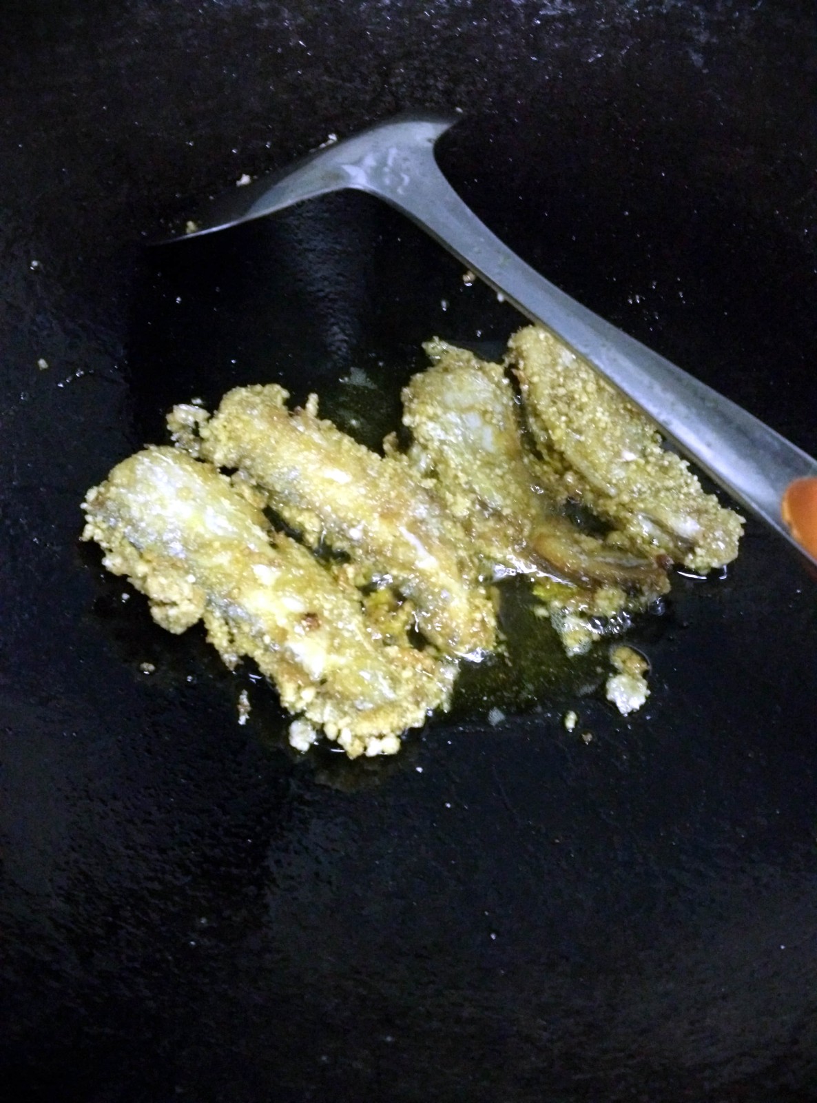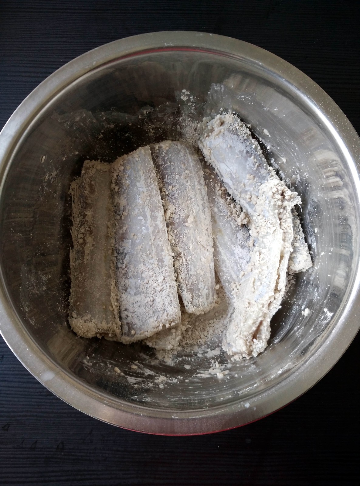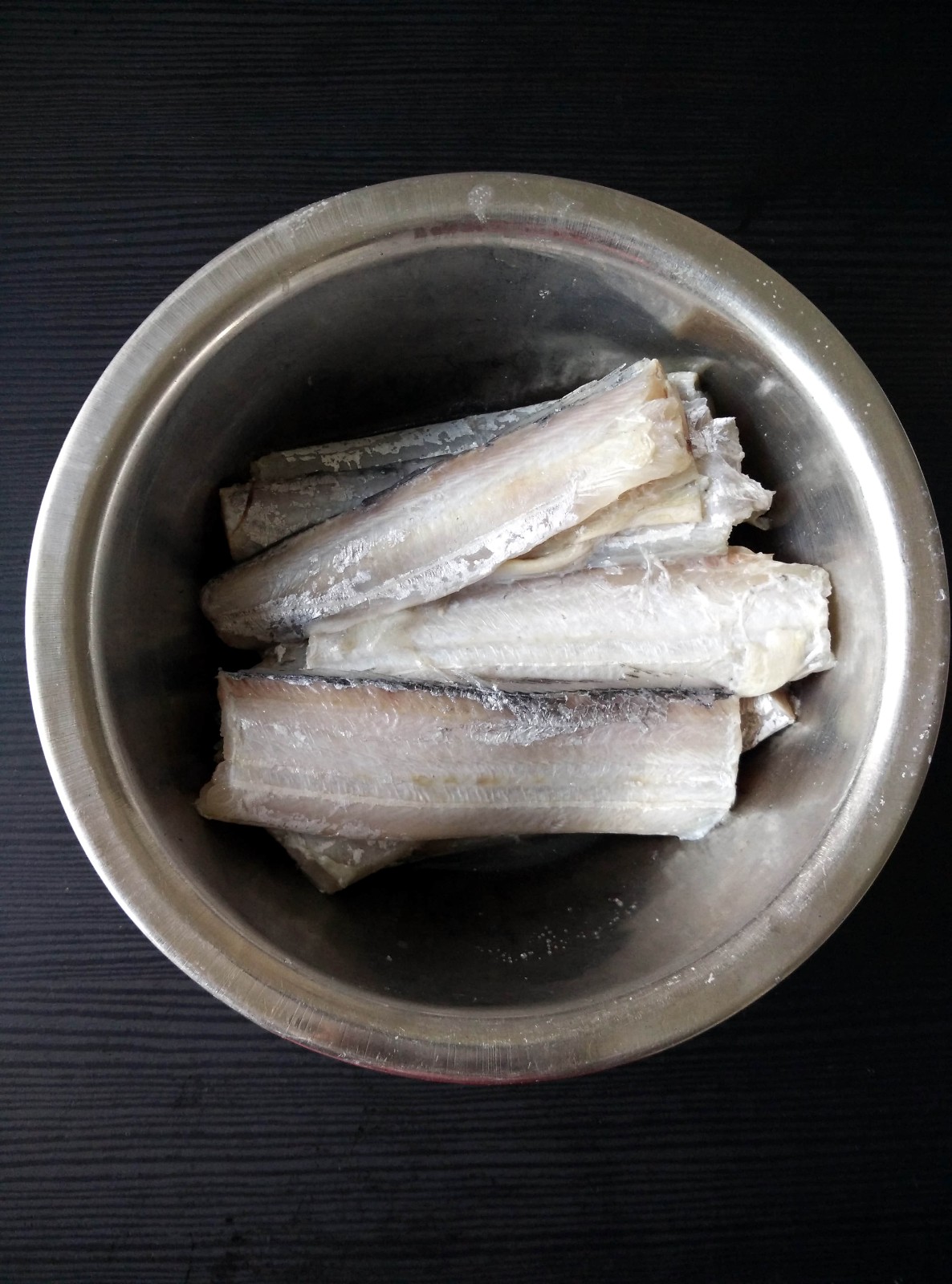 4. 腌制過的帶魚倒掉里面的水,拍上適量干淀粉;